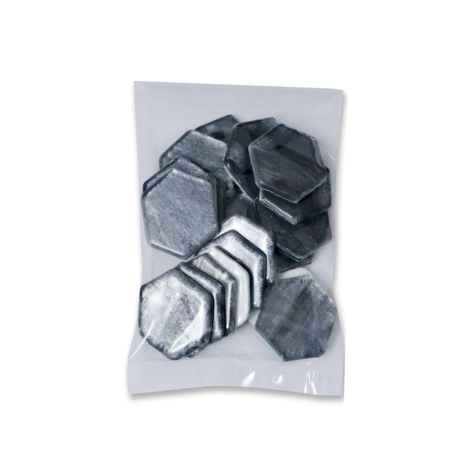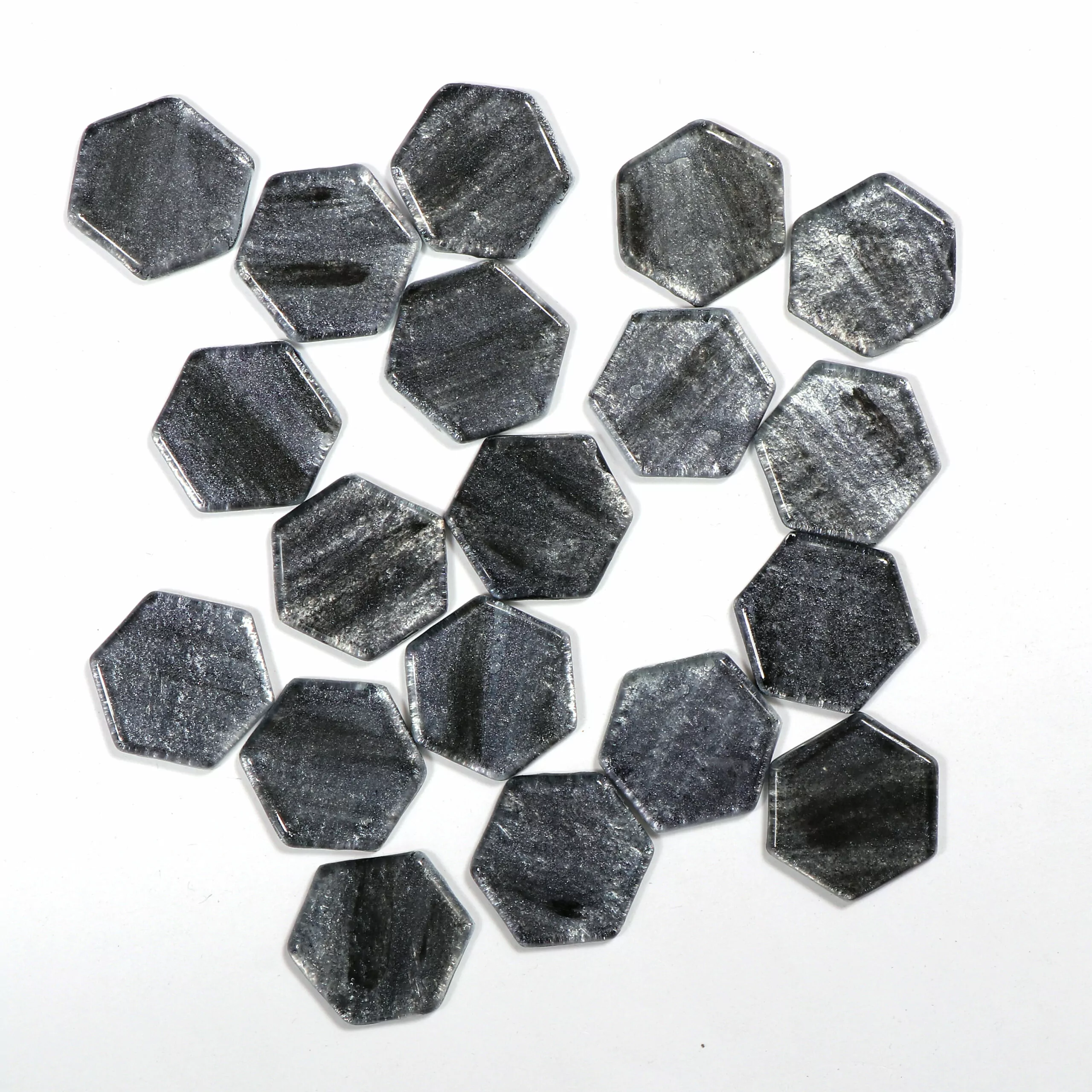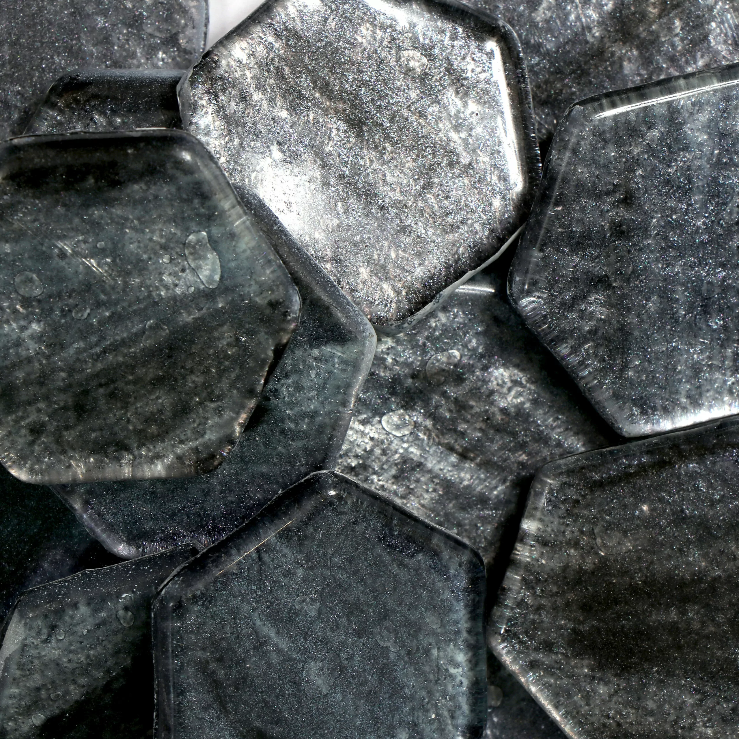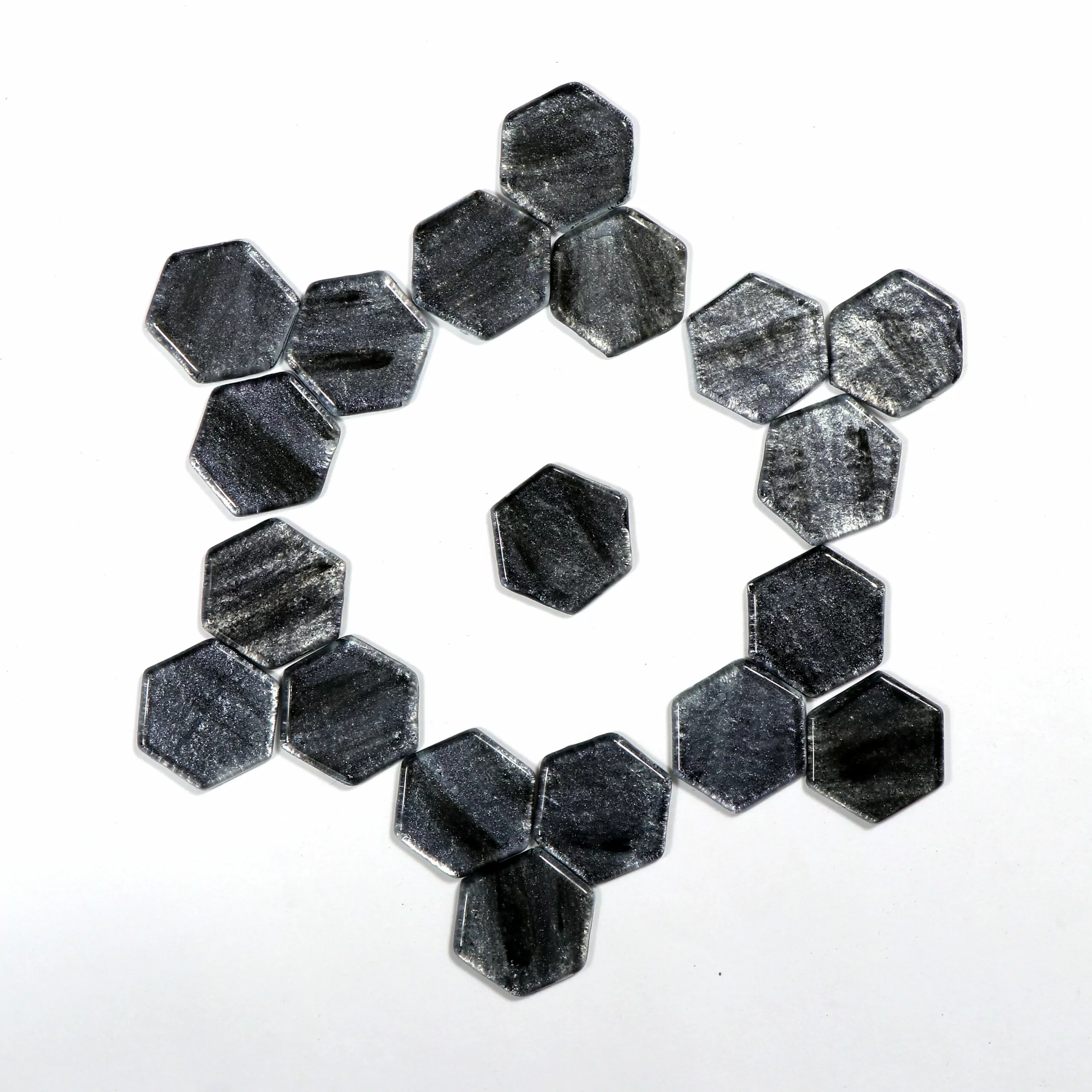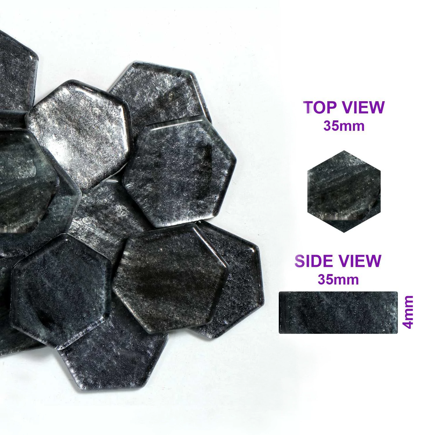 This 200gms pack of mosaic tiles contains 18-20 pieces approximately. These are hexagons in 35 mm size and 4mm thickness. It has smooth glass surface 2 shade brushing effect. The color will not fade in long time.