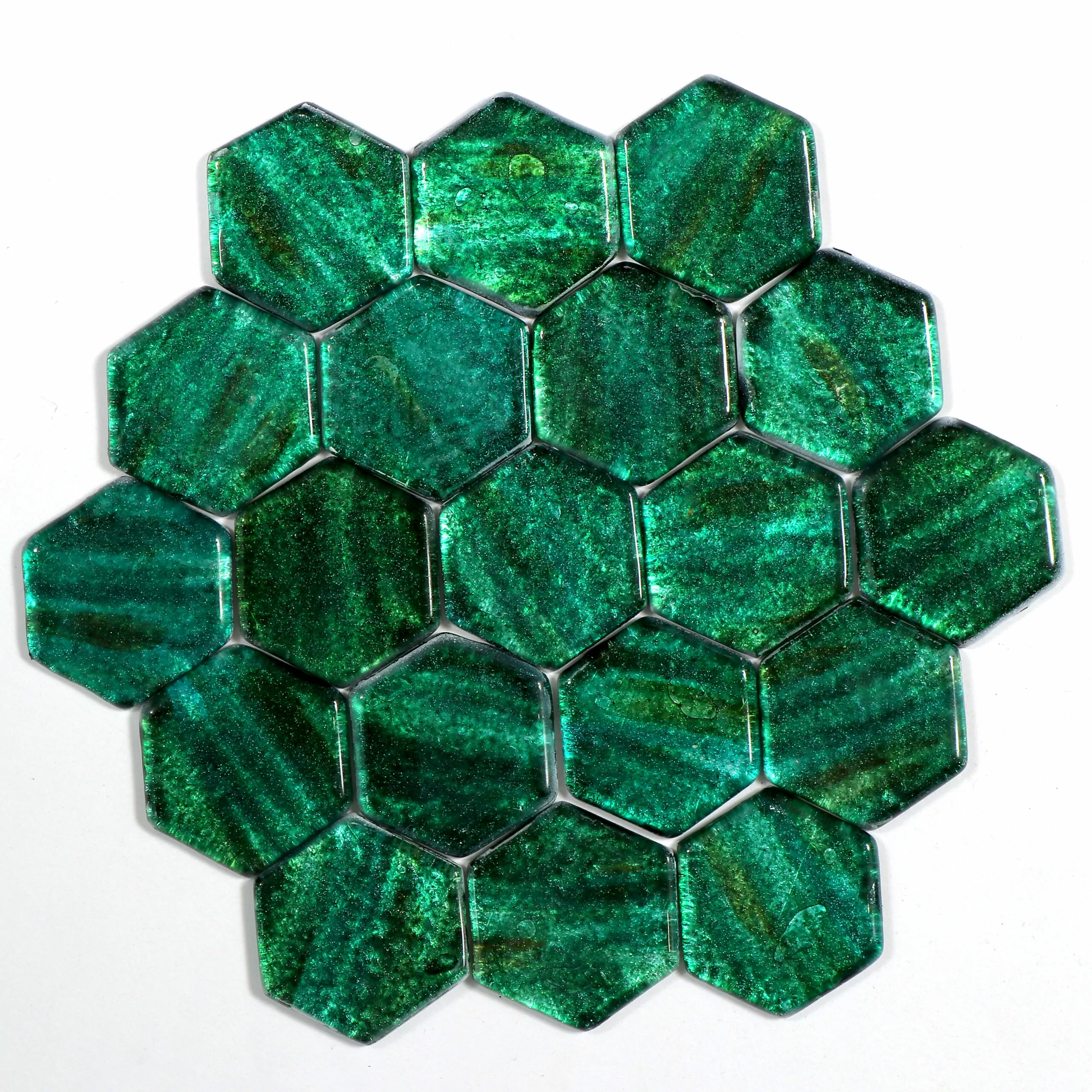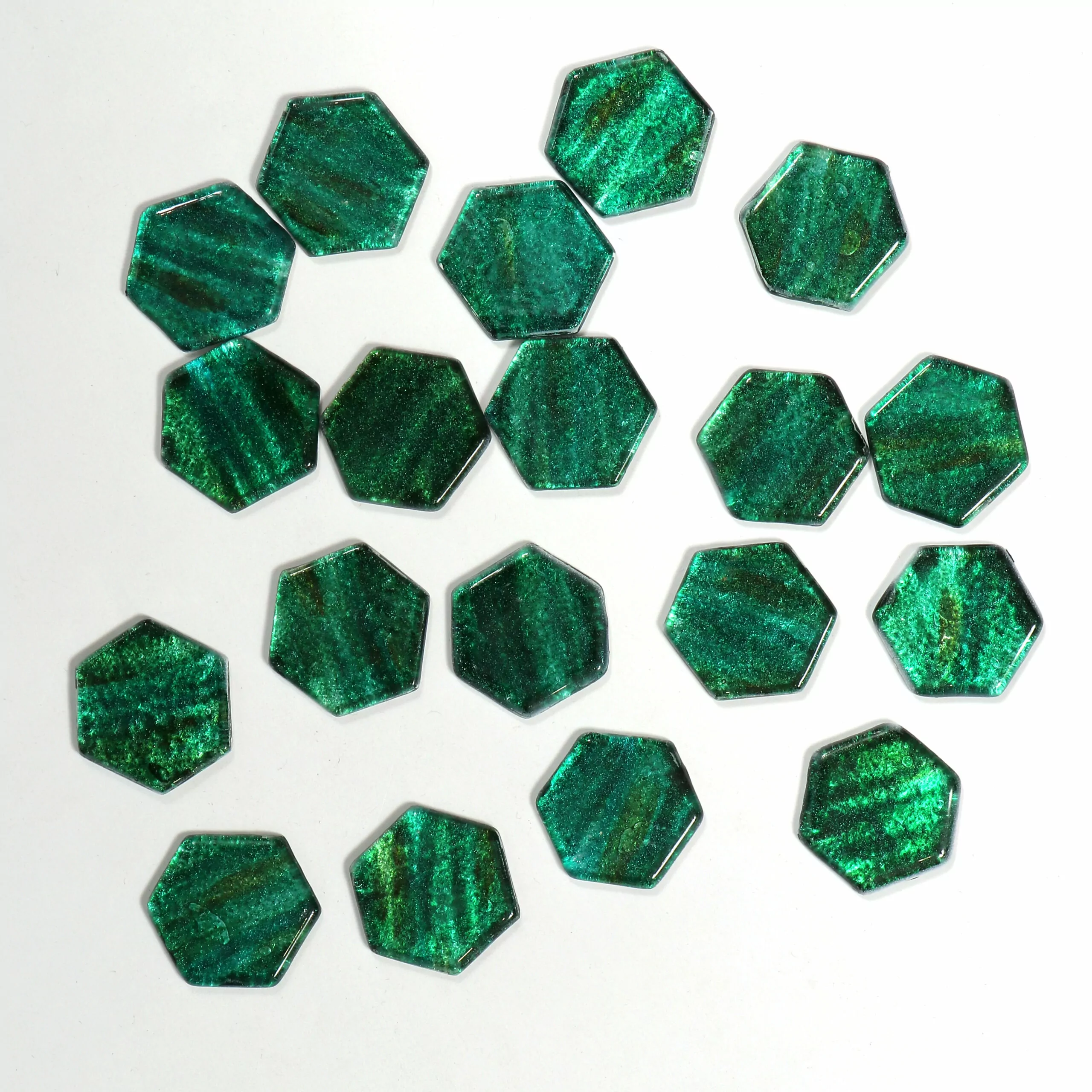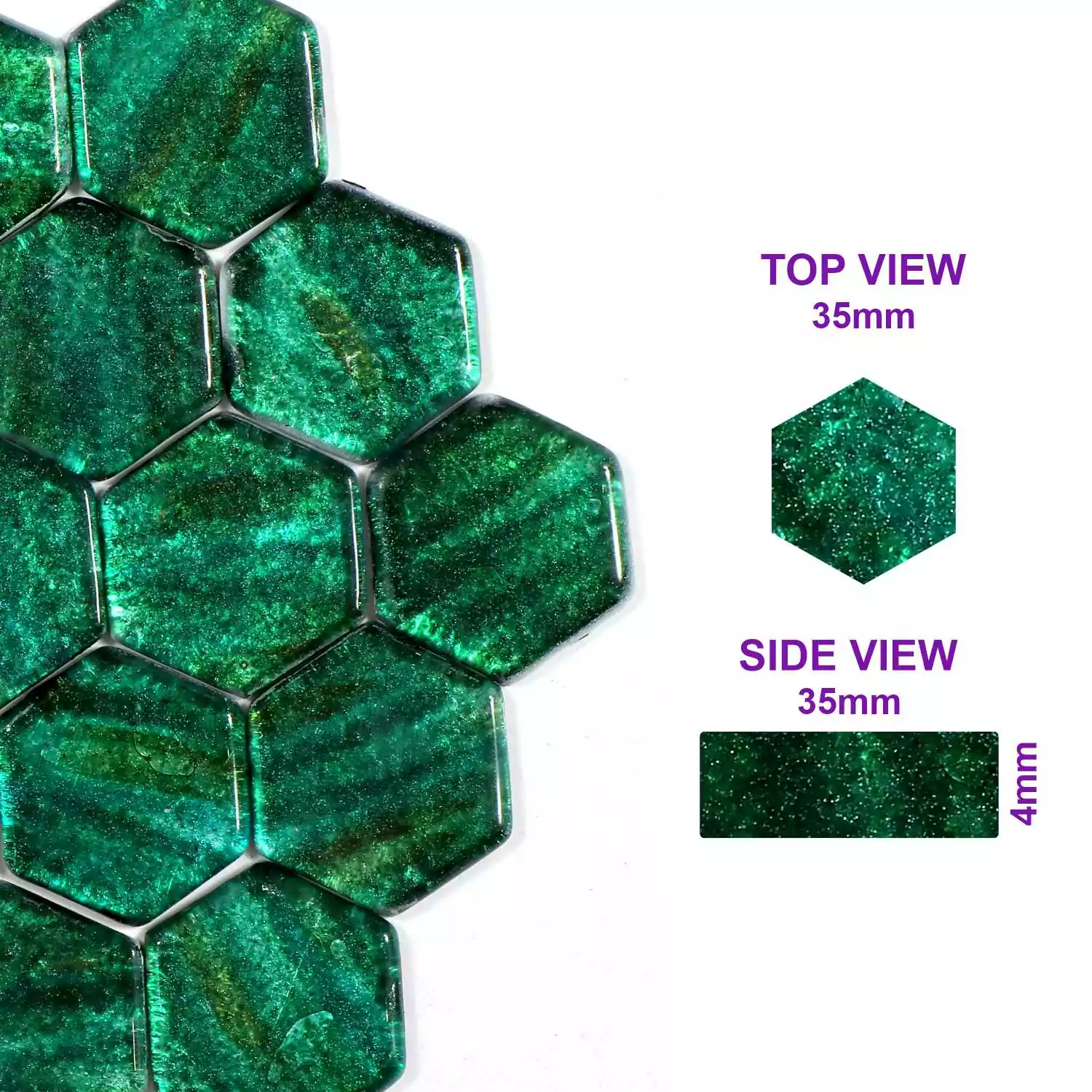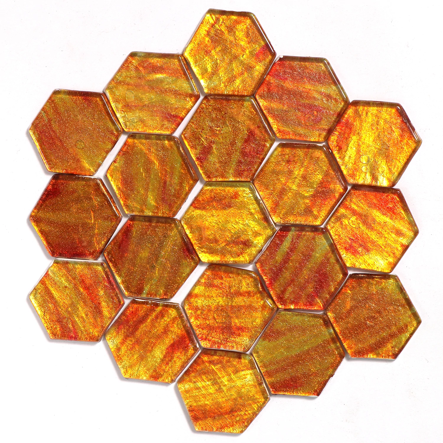 This 200 gms pack of mosaic tiles contains 18-20 pieces approximately. These are hexagons in 35 mm size and 4mm thickness. It has smooth glass surface 2 shade brushing effect. The color will not fade in long time.