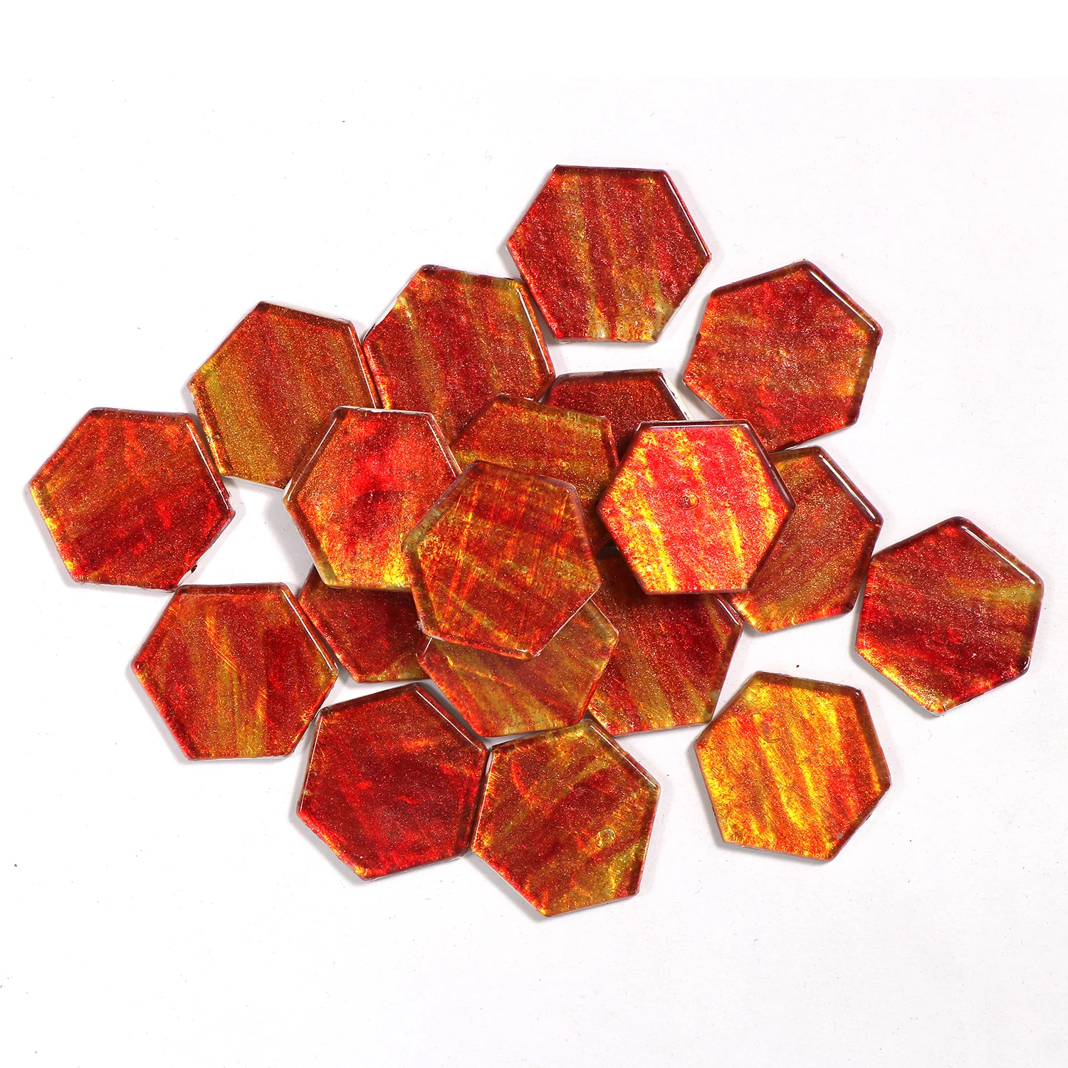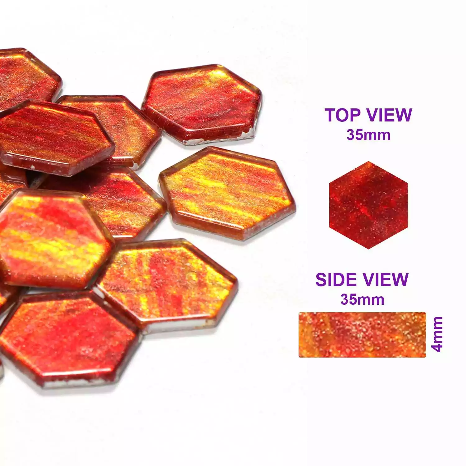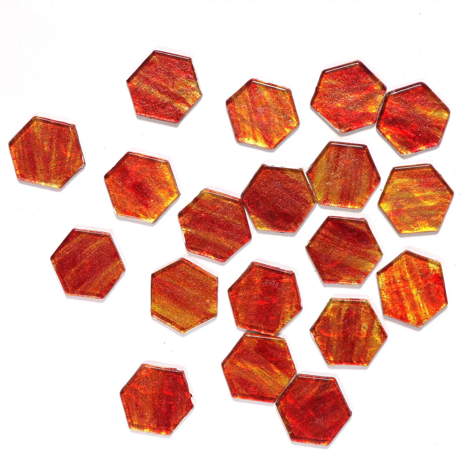 This 200gms pack of mosaic tiles contains 18-20 pieces approximately. These are hexagons in 35 mm size and 4mm thickness. It has smooth glass surface 2 shade brushing effect. The color will not fade in long time.