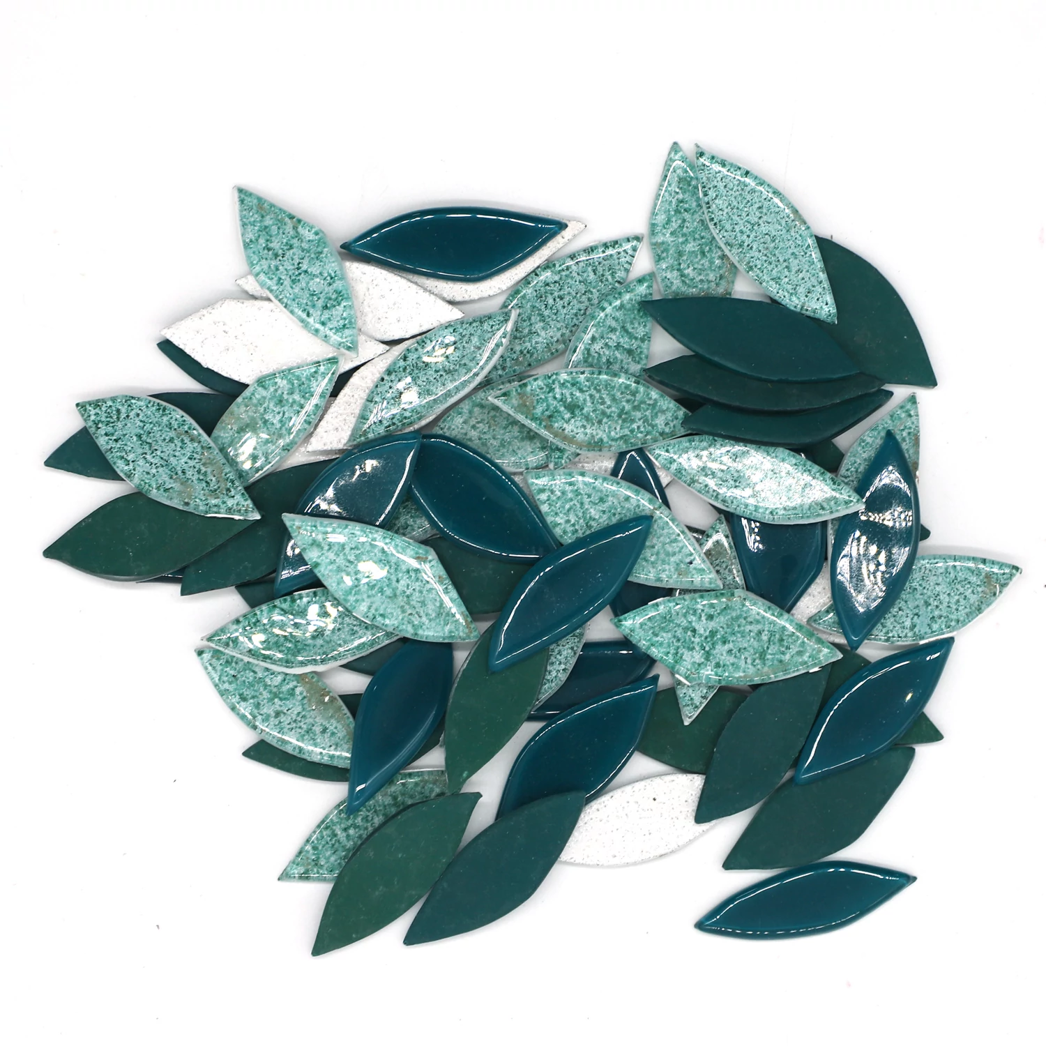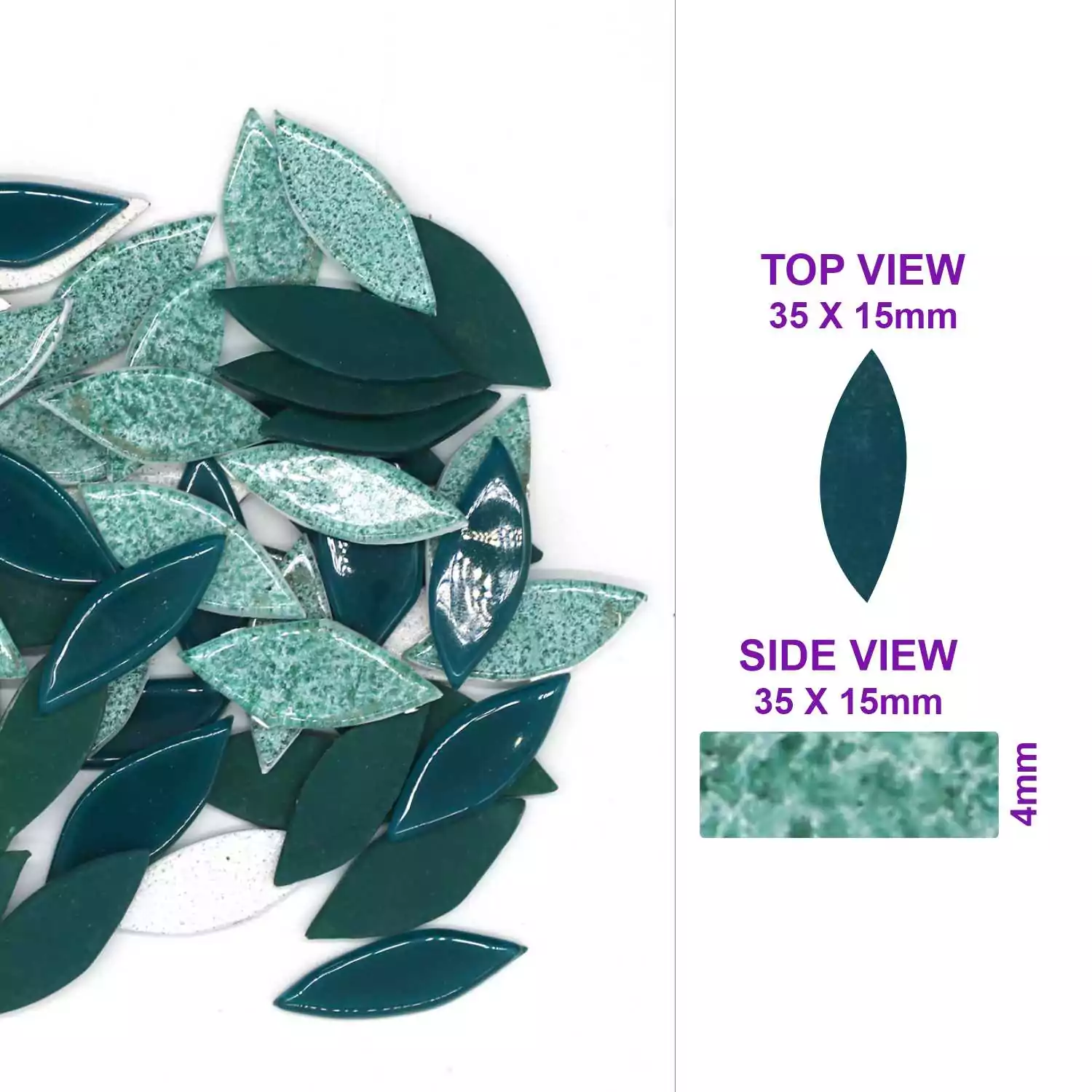 This 200gms pack of mosaic tiles contains 50-60 pieces approximately. They are leaves in 35mm size and 4mm thickness. The color will not fade in long time. Our mosaics are easy to use in making any kind of DIY products, decoration & crafting purpose, artworks etc. and doesn’t require nipping. They can be easily fixed with the help of glue.