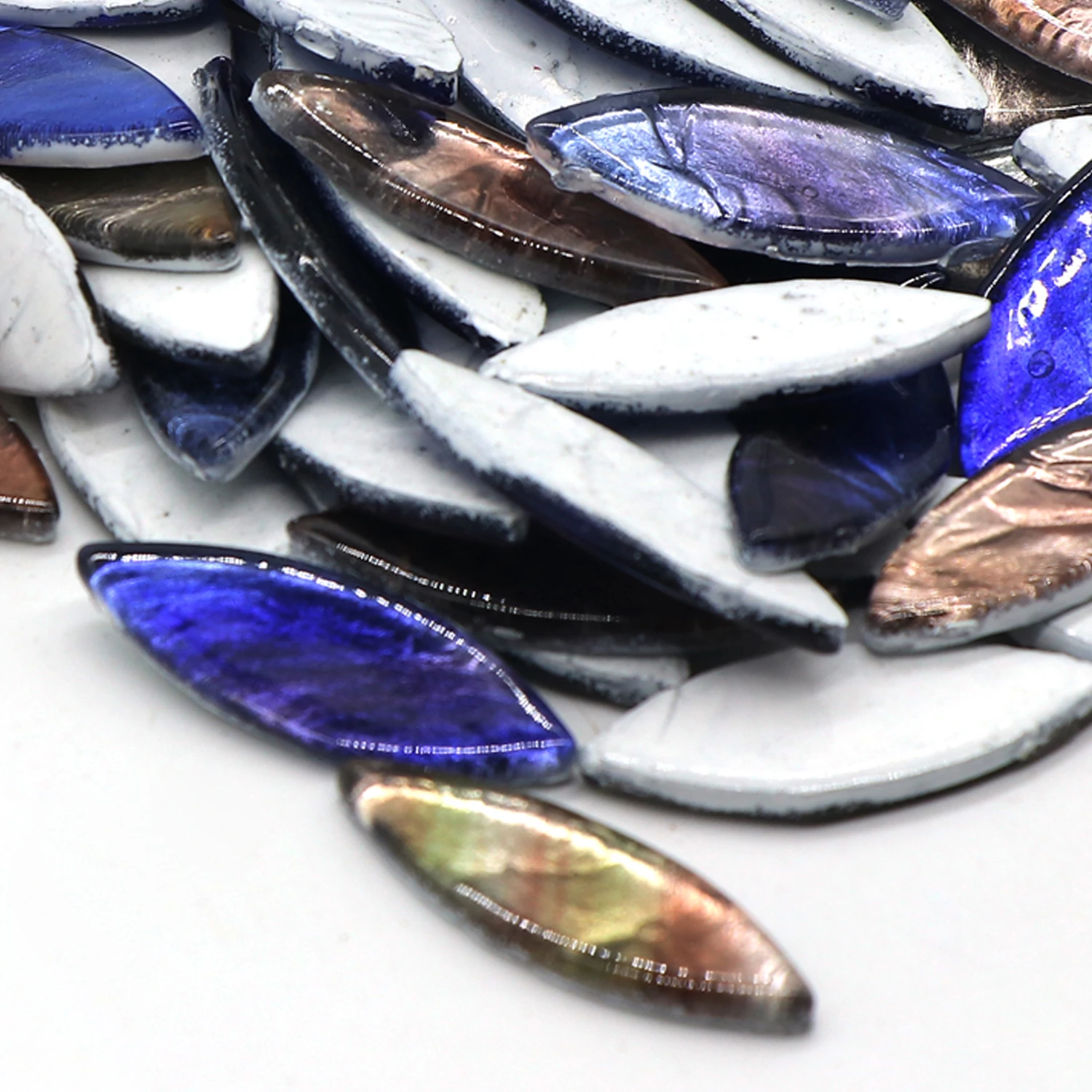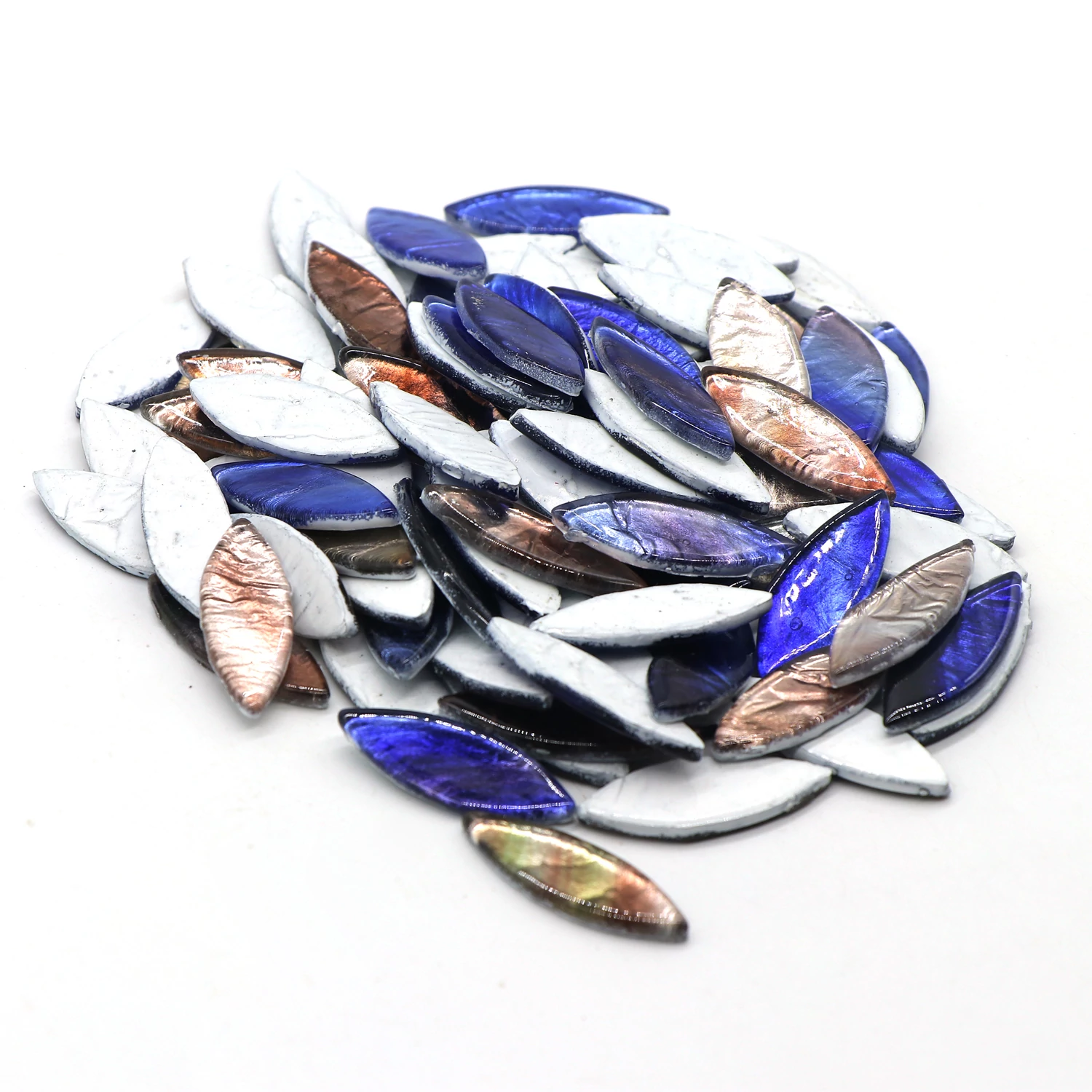 This 200gms pack of mosaic tiles contains 50-60 pieces approximately. They are leaves in 40x15mm size and 3mm thick.The color will not fade in long time. Our mosaics are easy to use in making any kind of DIY products, decoration & crafting purpose, artworks etc. and doesn’t require nipping. They can be easily fixed with the help of glue.