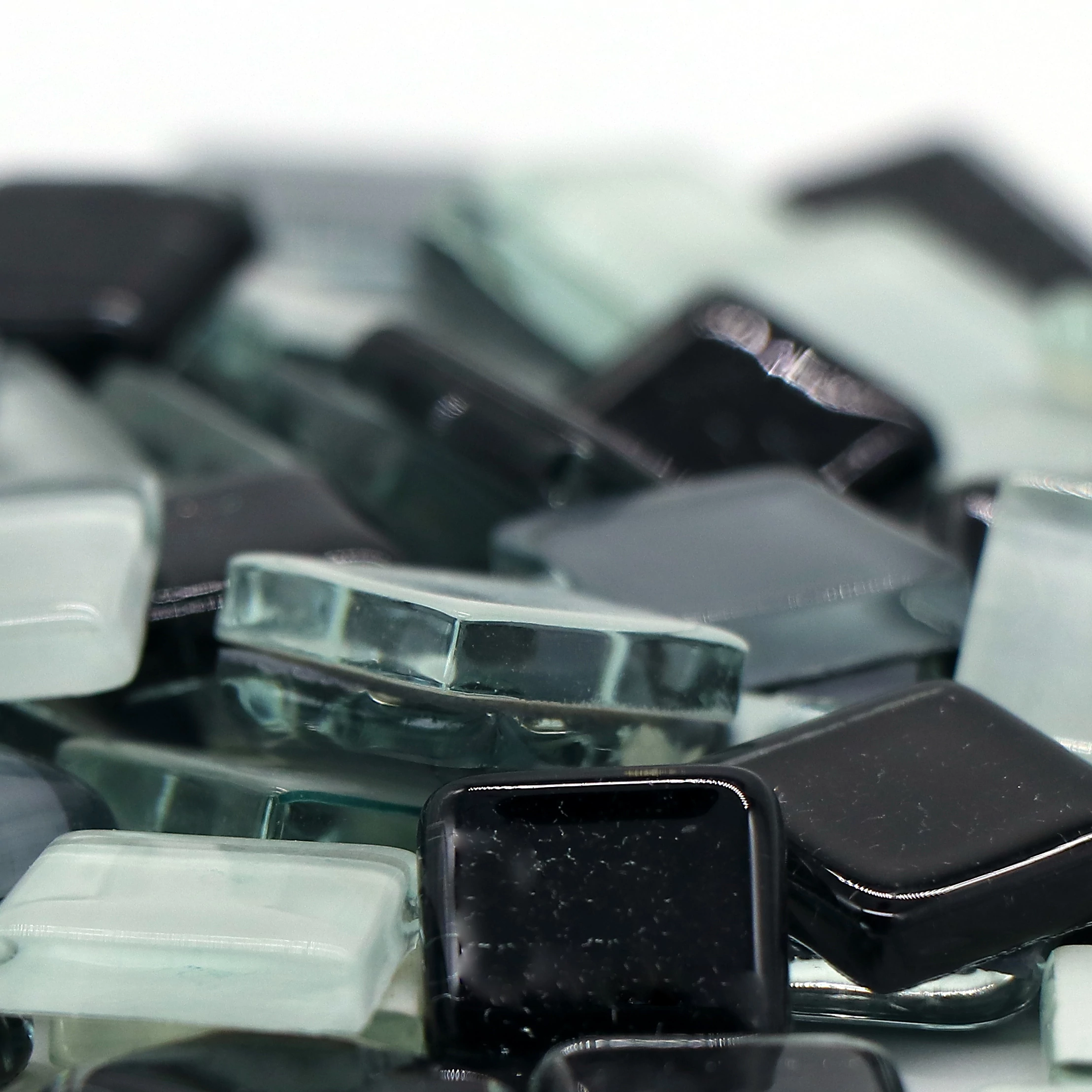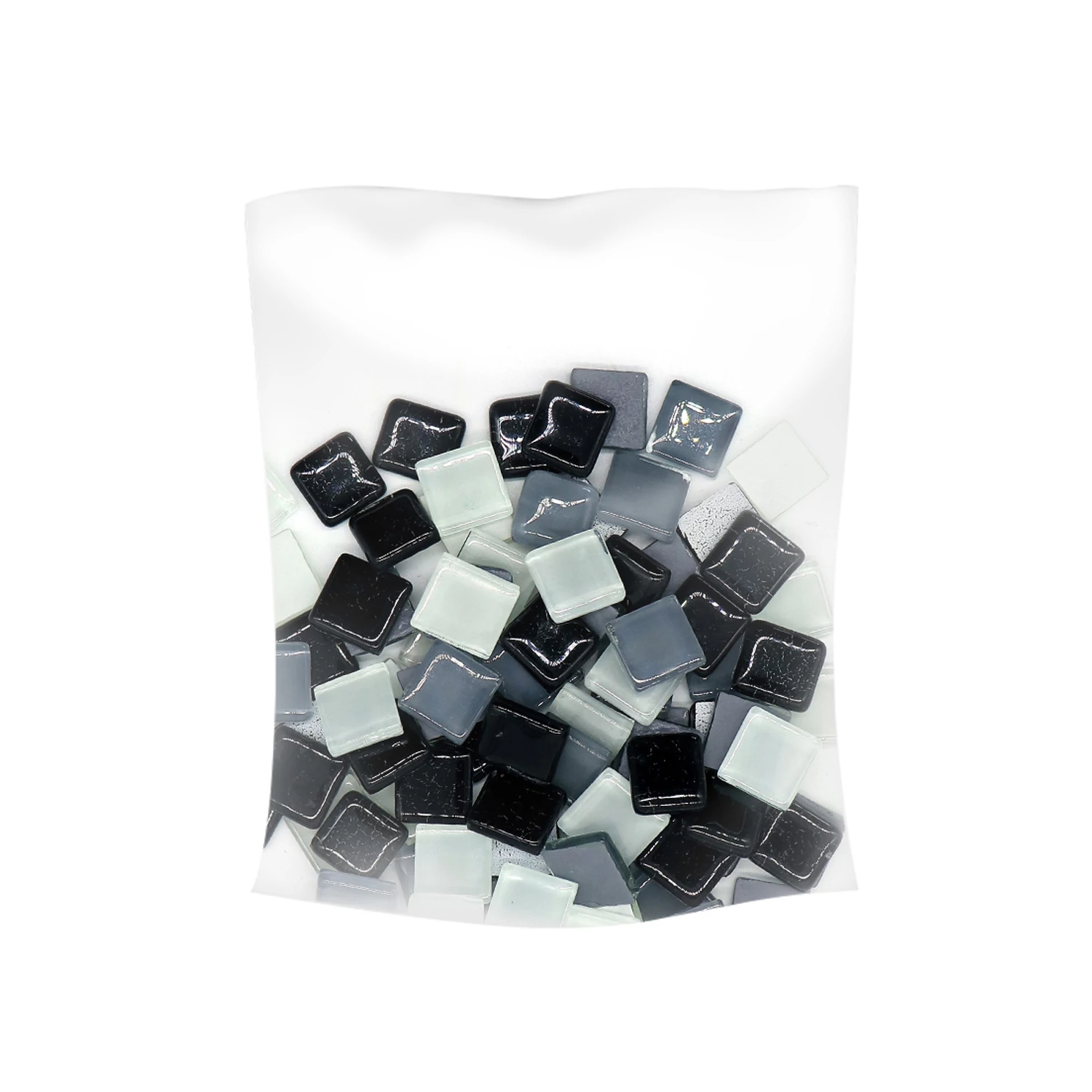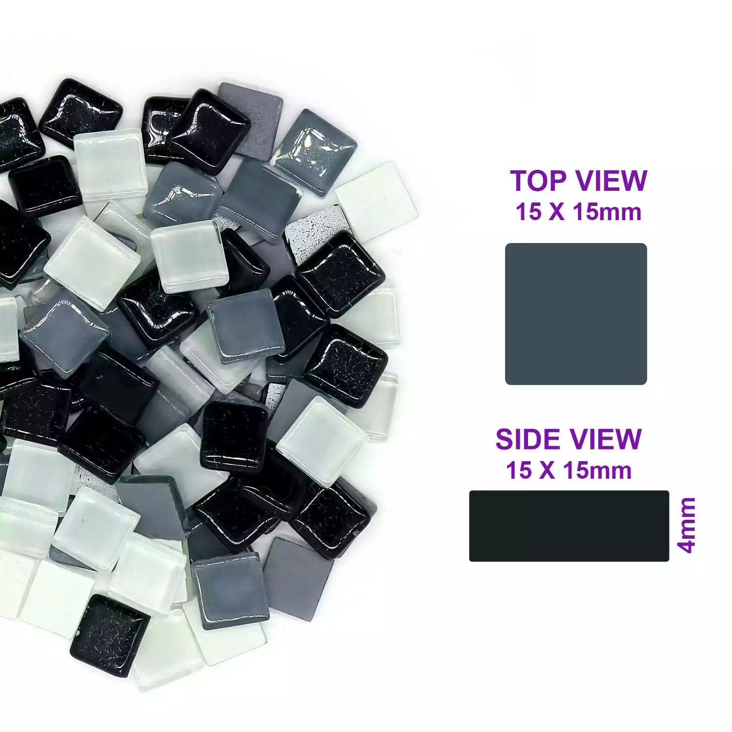 This 200gms pack of mosaic tiles contains 80-100 pieces approximately. These are squares in 15X15mm size and 4mm thickness. It has smooth glass surface and the color will not fade in long time.