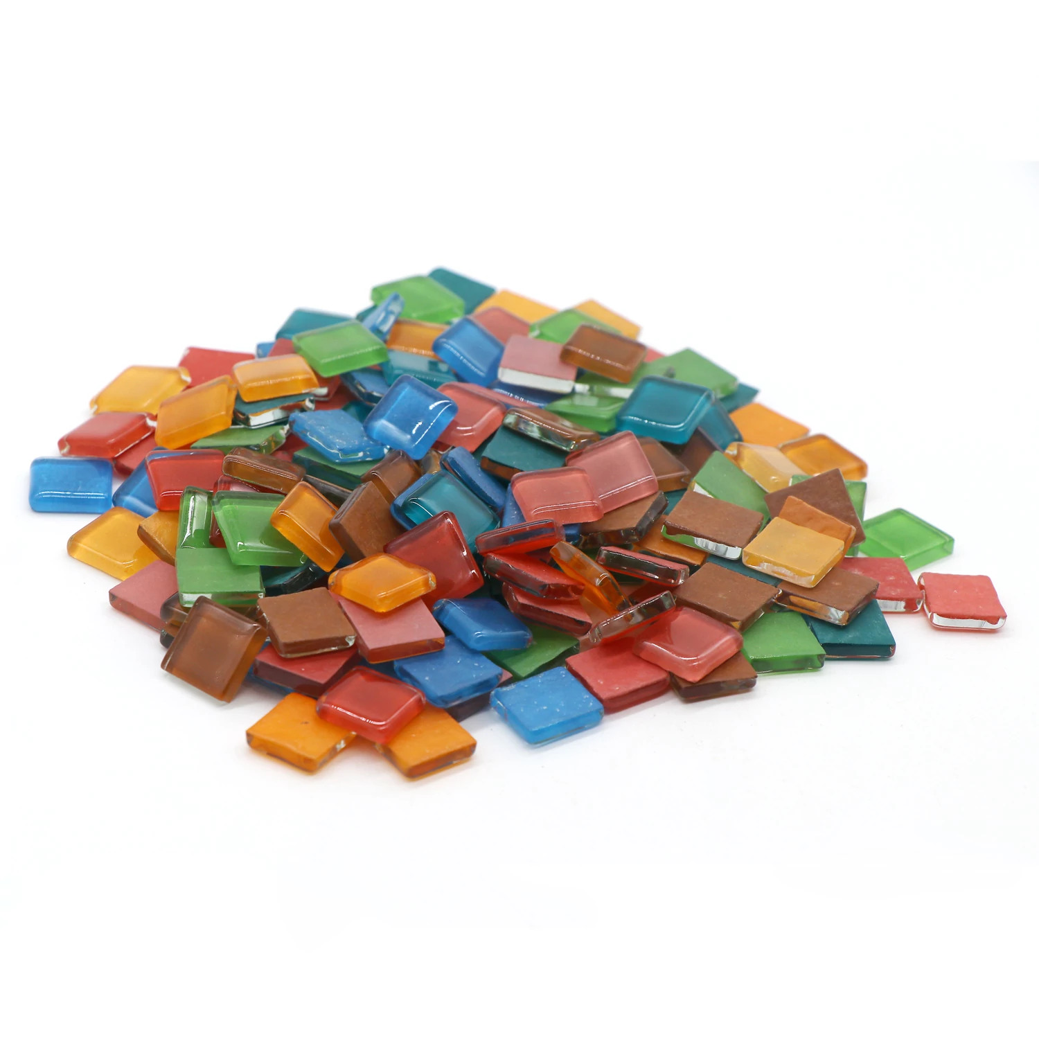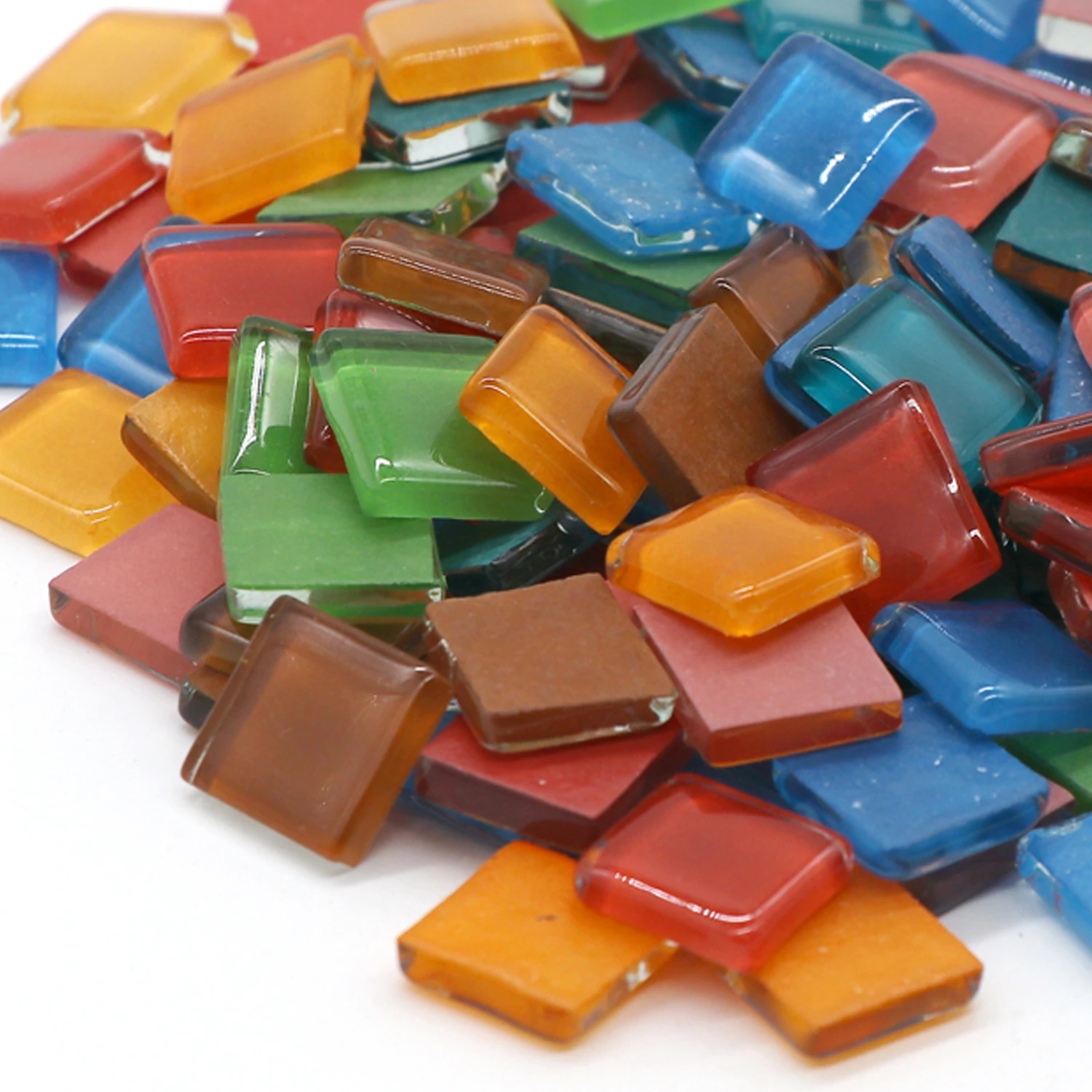This 370gms pack of mosaic tiles contains 150-180 pieces approximately. They are squares in 15X15mm size and 4mm thickness. It has smooth glass surface and the color will not fade in long time. Our mosaics are easy to use in making any kind of DIY products, decoration & crafting purpose, artworks etc. and doesn’t require nipping. They can be easily fixed with the help of glue.