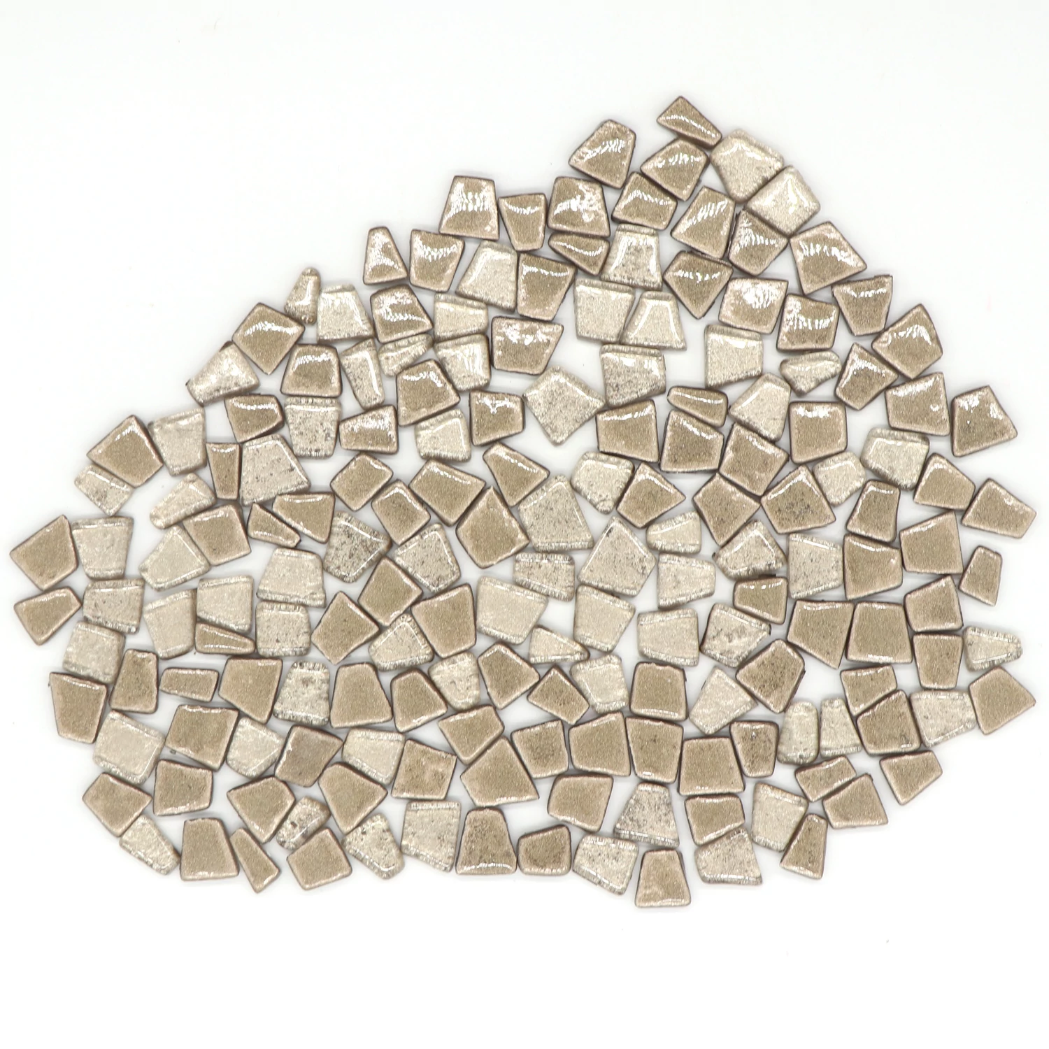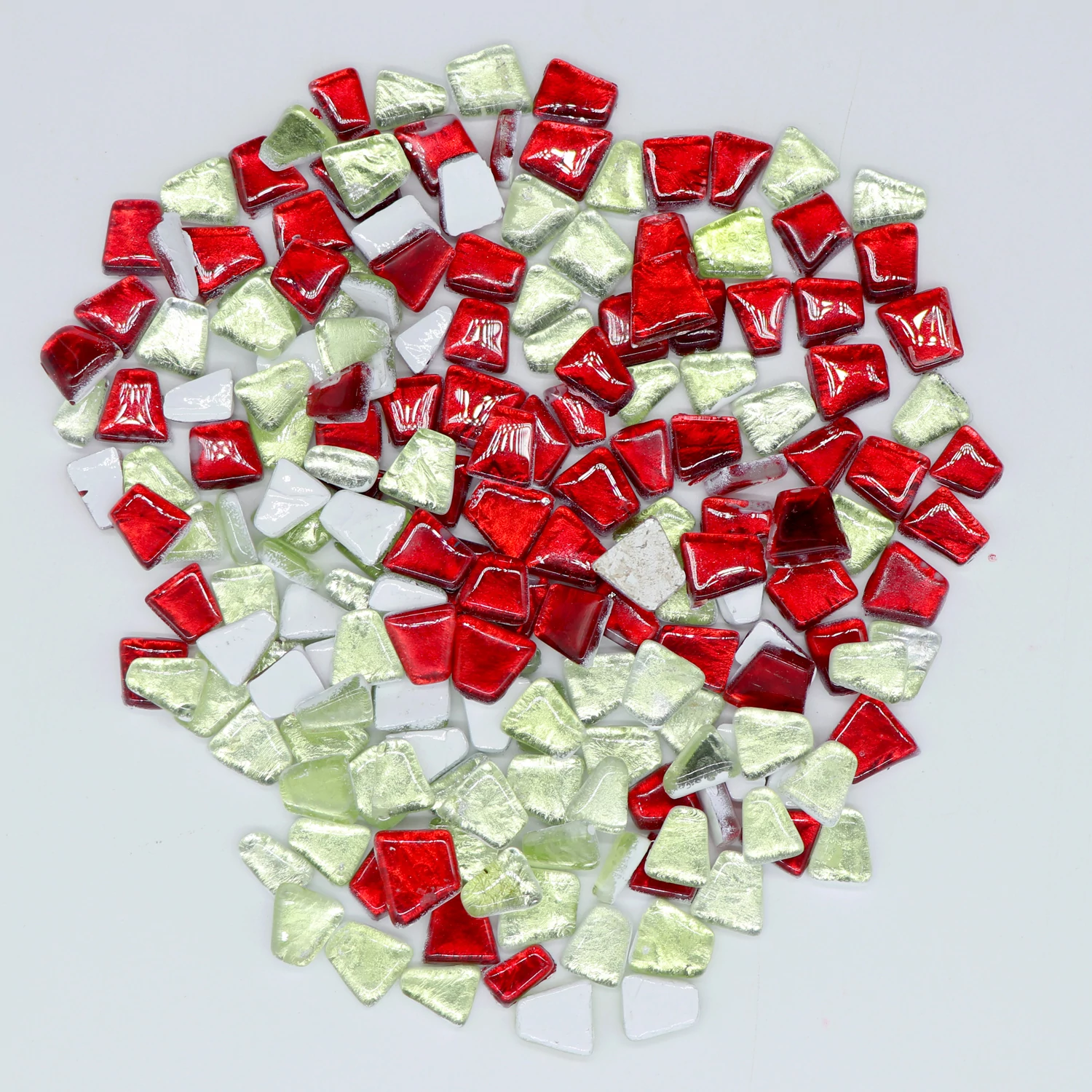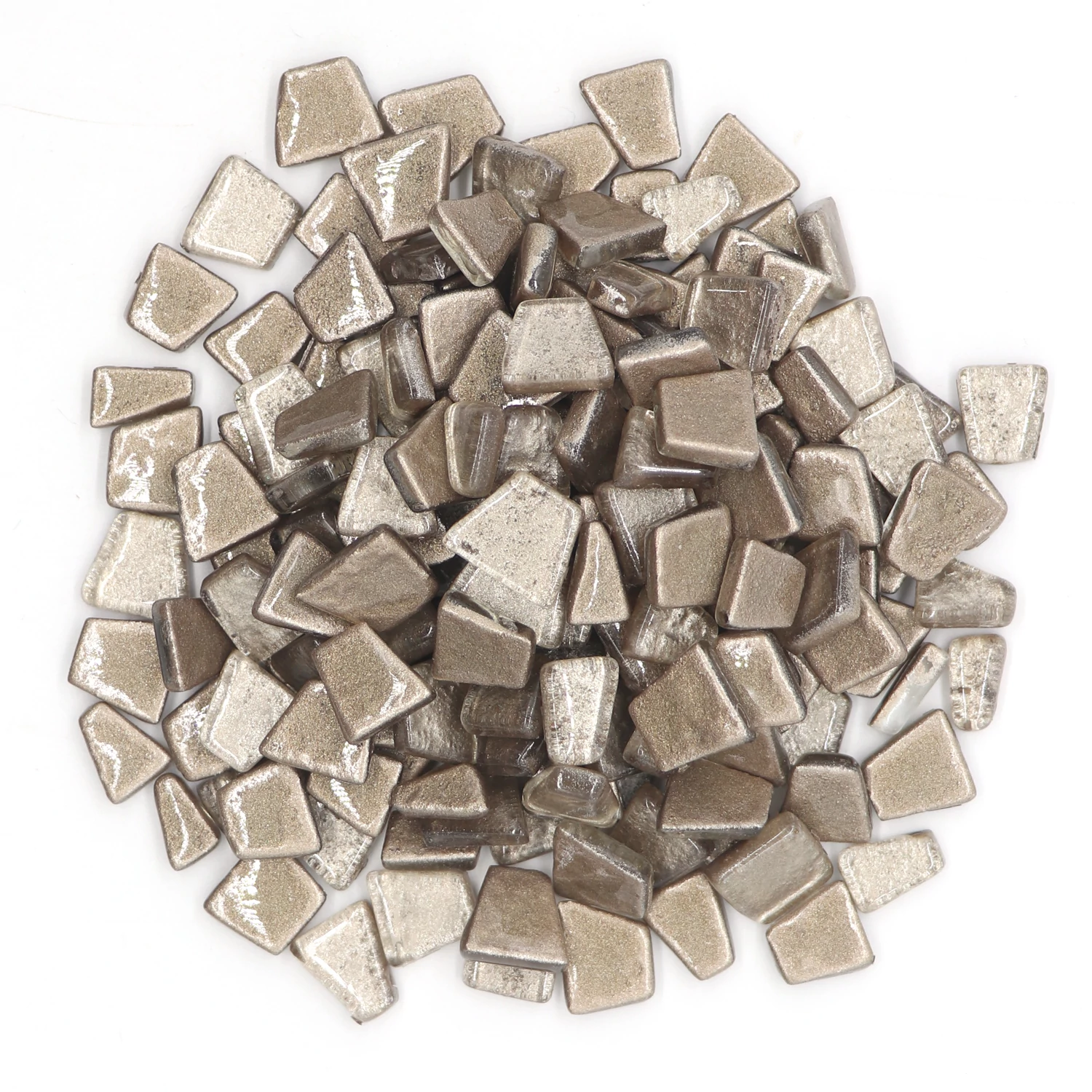 This 200gms pack of mosaic tiles contains 140-145 pieces approximately. These are irregular trapezoids which has smooth glass surface and the color will not fade in long time.