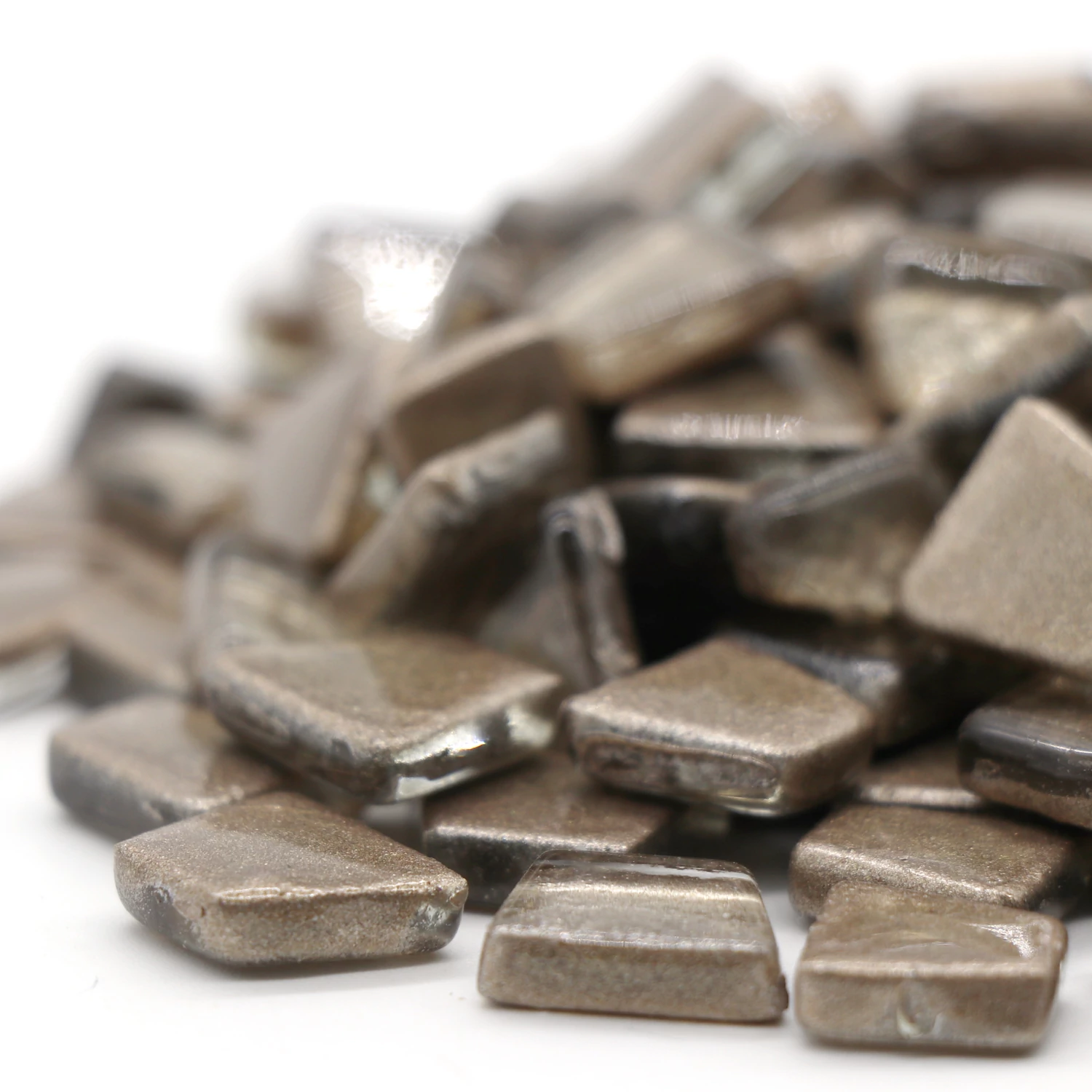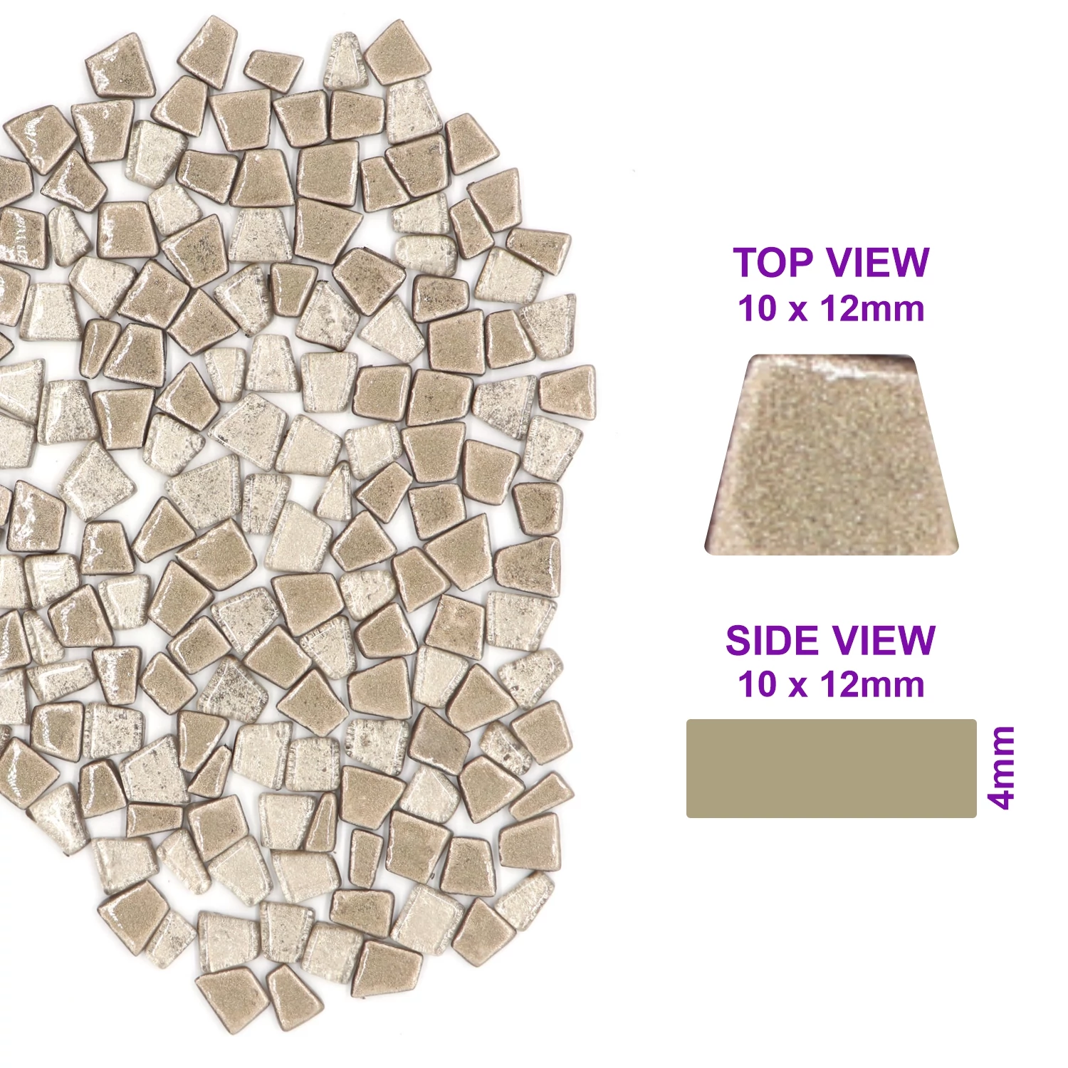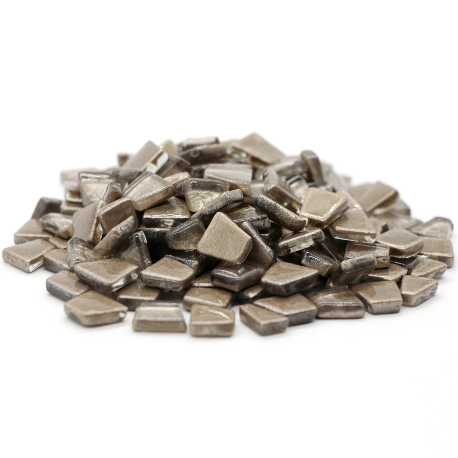 This 200gms pack of mosaic tiles contains 140-145 pieces approximately. These are irregular trapezoids which has smooth glass surface and the color will not fade in long time.