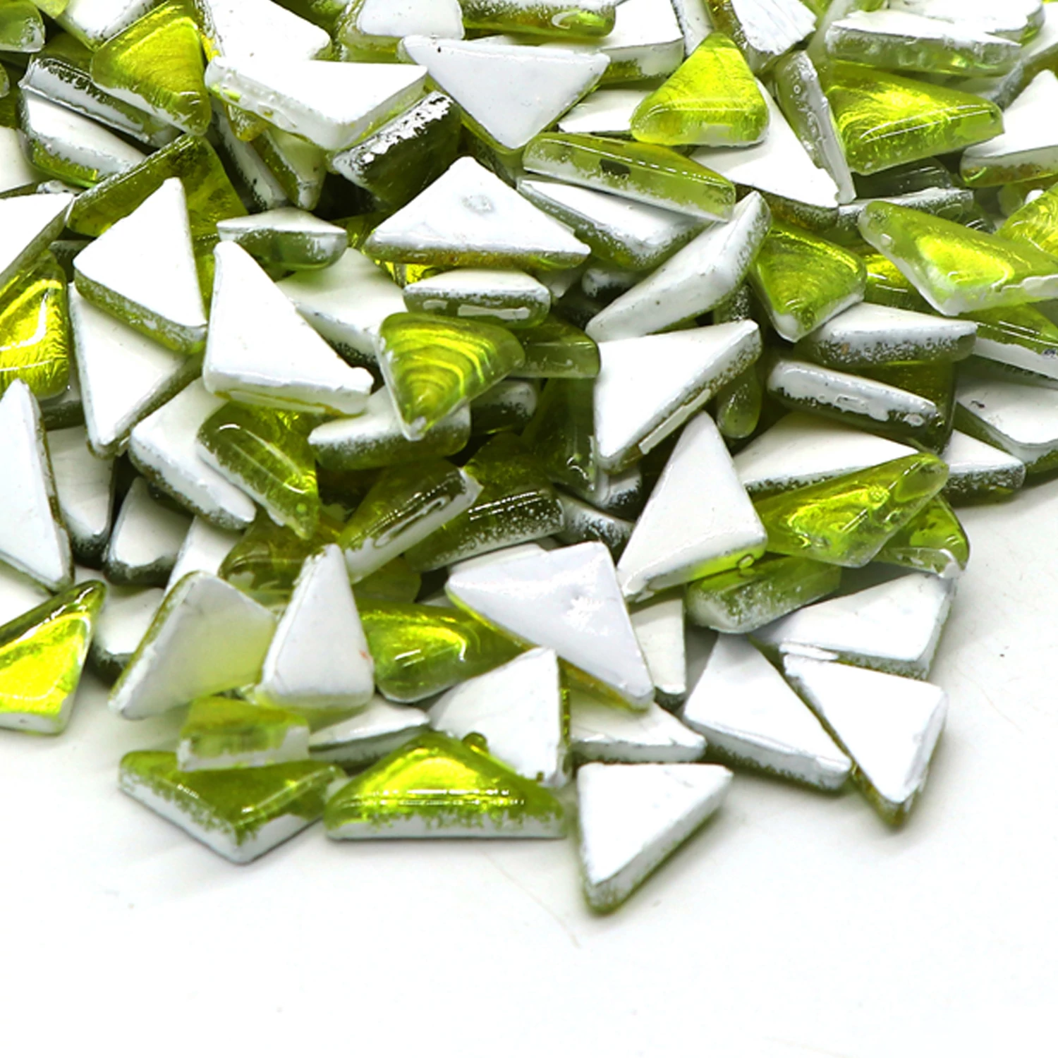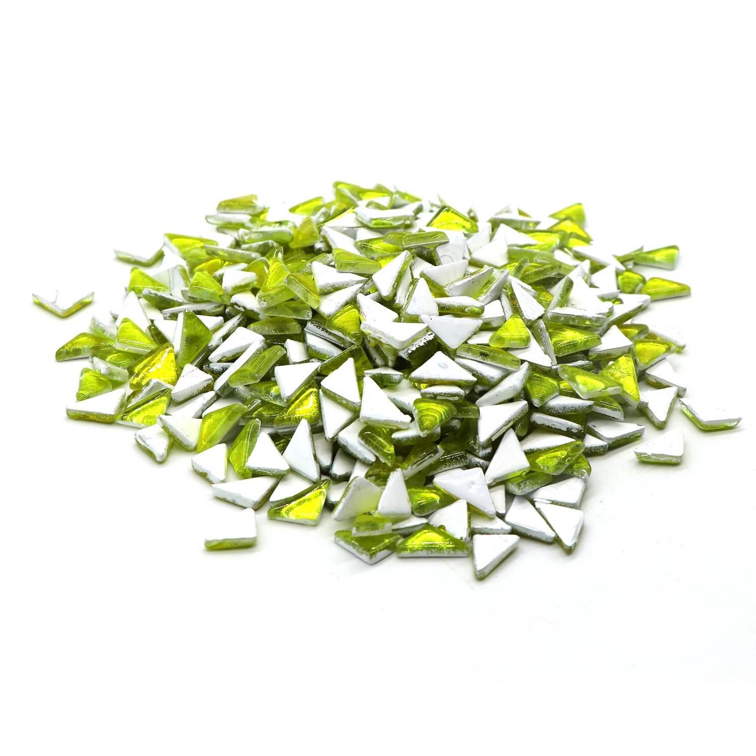 This 600gms pack of mosaic tiles contains 510-540 pieces approximately. These are irregular triangles in 15X15X20 mm size and 4mm thickness. It has smooth glossy glass surface. The color will not fade in long time. Our mosaics are easy to use in making any kind of DIY products, decoration & crafting purpose, artworks etc. and doesn’t require nipping. It can be easily fixed with the help of glue.